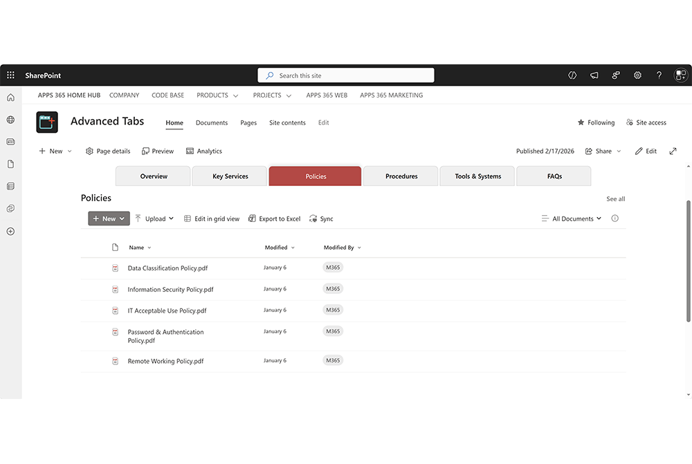 Advanced Tabs runs entirely within your Microsoft 365 tenant. It does not transmit or store SharePoint data outside your environment. It operates as a SharePoint-hosted SPFx solution and respects existing permissions and governance controls.